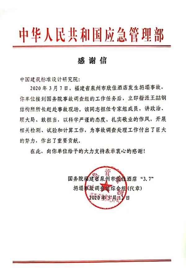 近日,中國建筑標準設(shè)計研究院有限公司(以下簡稱“標準院”)收到來自中華人民共和國應(yīng)急管理部的感謝信,對標準院鋼結(jié)構(gòu)專家王喆參加國務(wù)院福建省泉州市欣佳酒店“3?7”坍塌事故調(diào)查工作表示感謝。