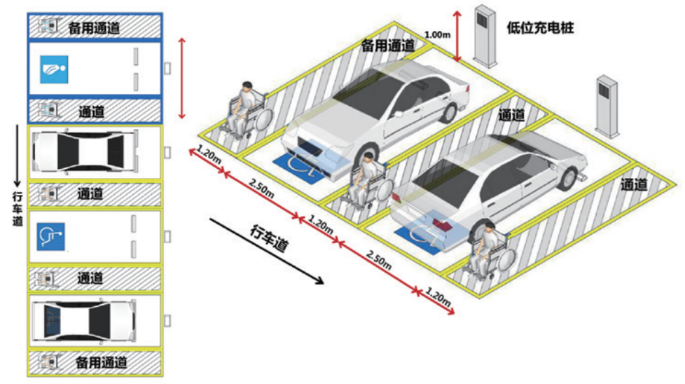 使用“N+1”停車(chē)位的設(shè)計(jì)理念,即N車(chē)位數(shù)+1通道數(shù),為不同停車(chē)方向下車(chē)的輪椅使用者提供方便。無(wú)障礙機(jī)動(dòng)車(chē)停車(chē)位為藍(lán)色,孕婦停車(chē)位為黃色,與普通車(chē)位區(qū)分,并涂有停車(chē)線、輪椅通道線和無(wú)障礙標(biāo)志,配有低位充電樁。