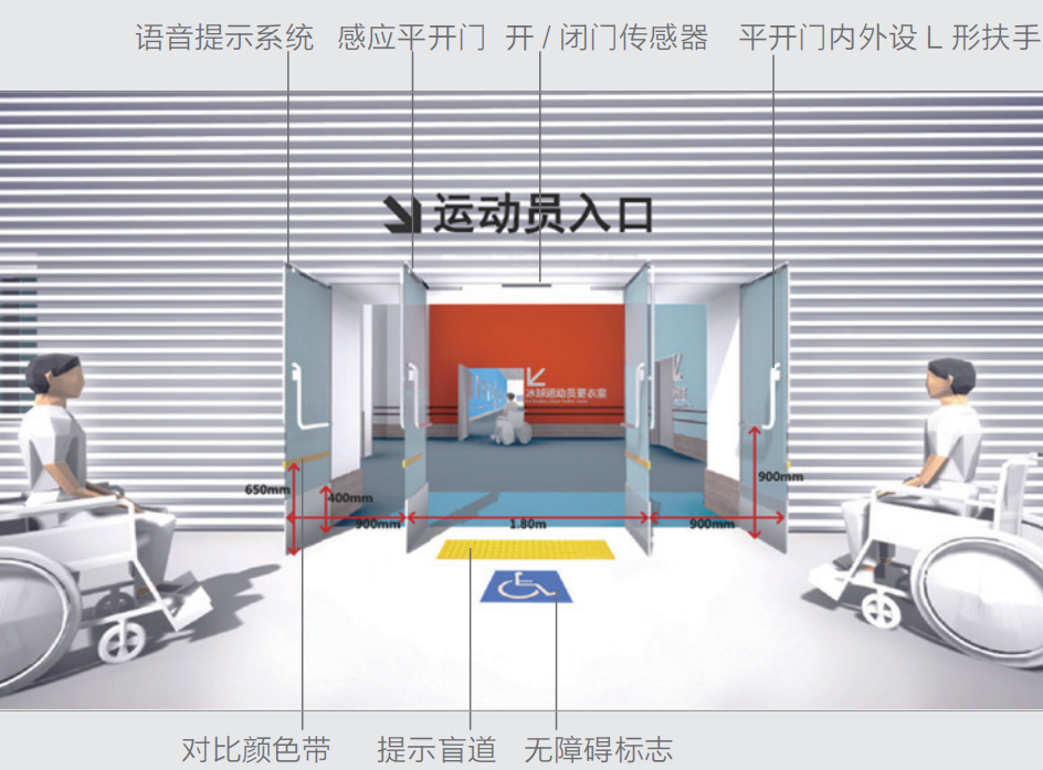 場(chǎng)館及綜合樓的出入口為無(wú)障礙平坡出入口,坡度為1:50,并設(shè)有遮陰避雨設(shè)施,地面平整、防滑。入口門(mén)為感應(yīng)平開(kāi)門(mén),通行凈寬雙扇1.8m不設(shè)置門(mén)檻,以保證輪椅通行。