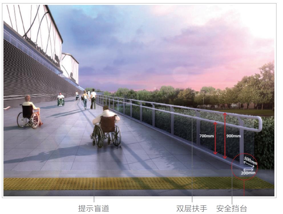 西側(cè)主坡道作為觀眾主入口,會(huì)有大量人群同時(shí)進(jìn)入,該坡道縱向坡度為1:20,輪椅使用者可自行上坡,無(wú)需他人幫助;并在坡道兩側(cè)設(shè)雙層扶手。上層高度為900mm,下層高度為700mm,可以同時(shí)滿足正常人與坐輪椅人的抓握高度需求。