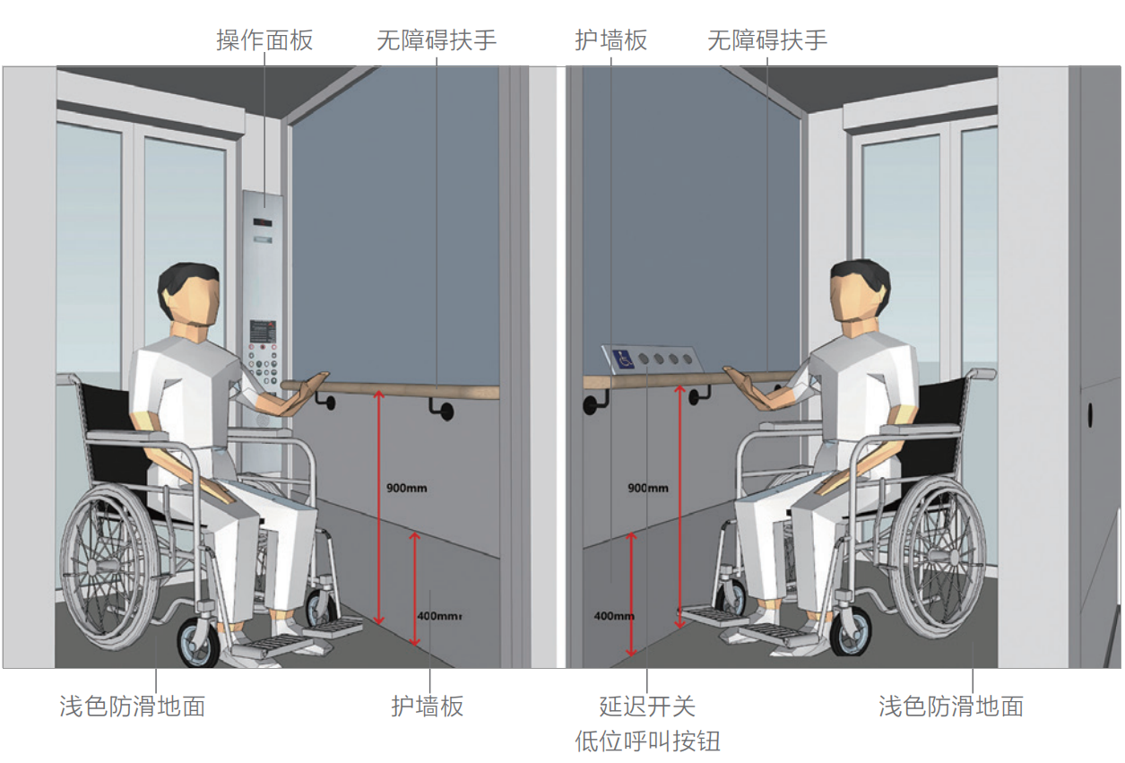 電梯門(mén)應(yīng)保持5~20s的開(kāi)啟時(shí)間,除非使用者操作轎廂內(nèi)的轎門(mén)開(kāi)關(guān)按鈕,確保人員安全通行時(shí)間。轎廂的三面壁上設(shè)高900mm扶手。轎廂內(nèi)部的設(shè)計(jì)與安裝要避免造成傷害,不存在尖角或凸出物。轎廂內(nèi)三面采用鏡面不銹鋼,可將轎廂環(huán)境盡收眼底。輪椅進(jìn)出時(shí),能通過(guò)鏡面觀察周?chē)闆r,進(jìn)退自如。