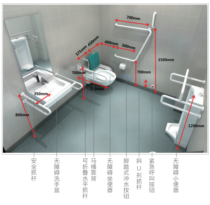 衛(wèi)生間入口無(wú)門(mén)檻,門(mén)旁邊設(shè)置低位開(kāi)關(guān)按鈕。衛(wèi)生間內(nèi)包括無(wú)障礙坐便器、小便器、洗手盆、鏡子、取紙器、U形抓桿、可折疊水平抓桿、安全扶手、腳踏式按鈕、多功能臺(tái)、呼叫按鈕、掛衣鉤等設(shè)施,隔間內(nèi)部輪椅回轉(zhuǎn)直徑為1.50m。