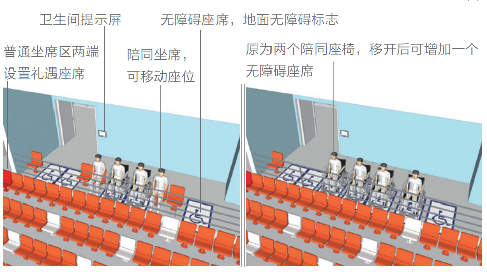 觀眾席的設(shè)計(jì)在無(wú)障礙坐席旁邊1:1配了陪同座椅,并且成對(duì)布置,可使兩個(gè)無(wú)障礙坐席相鄰而坐,方便交流。
