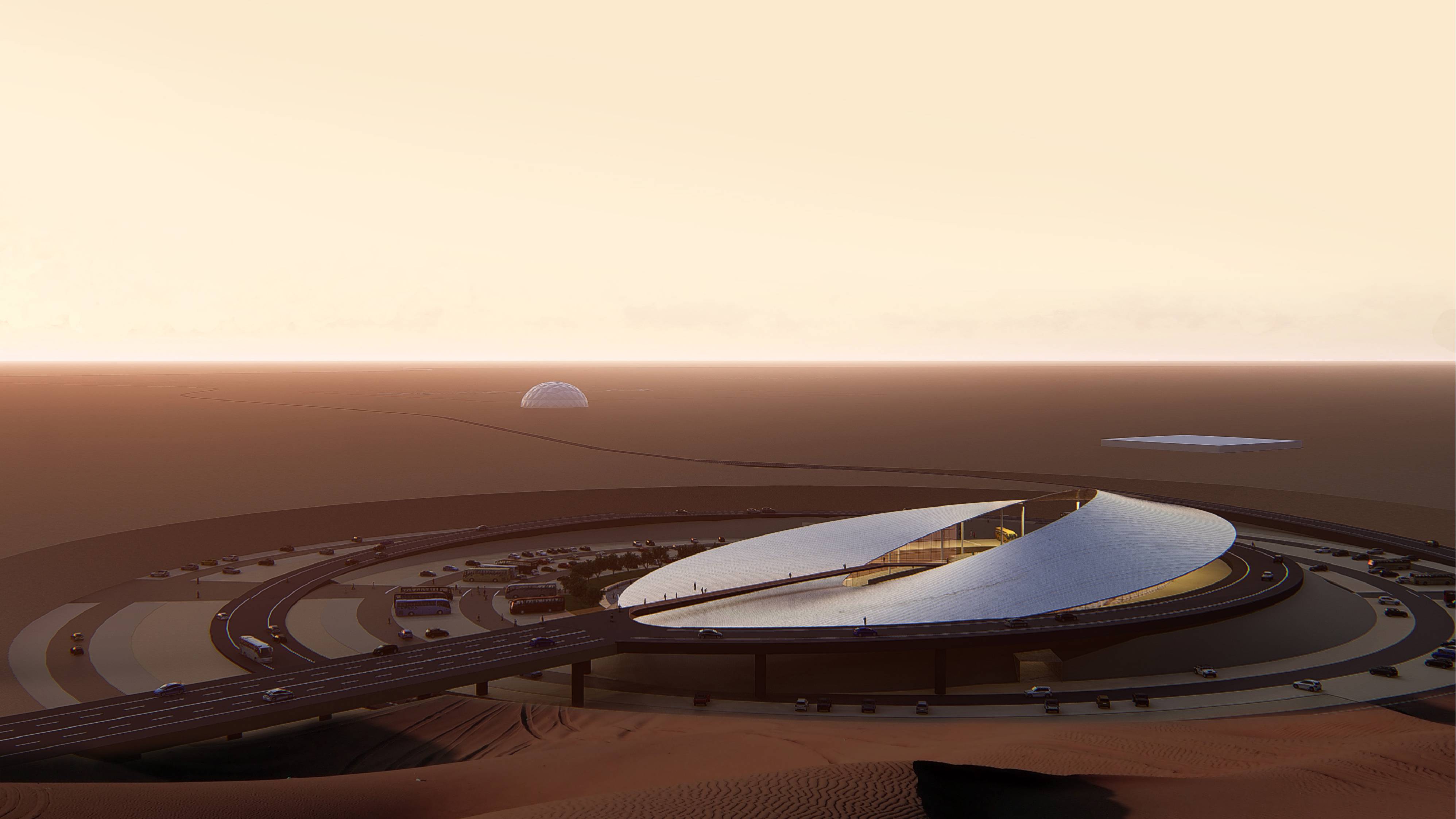 項(xiàng)目建成后,將集成游客接待,旅游信息咨詢以及公交系統(tǒng)換乘等基本功能,滿足往來游客旅游集散需求,是進(jìn)入沙坡頭5A級(jí)景區(qū)的第一站。其形態(tài)宛如墜落于沙丘間的外星來客,為游人創(chuàng)造了穿越“蟲洞”般的獨(dú)特體驗(yàn),與塞外茫茫大漠形成鮮明對(duì)比,提升了中國沙漠旅游之門的整體形象。未來,必將成為國內(nèi)西部地區(qū)知名旅游景點(diǎn)的網(wǎng)紅打卡圣地。