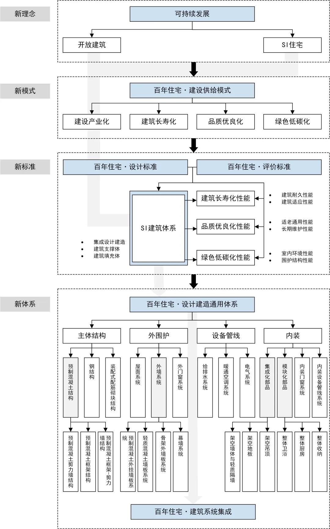 百年住宅正是基于國(guó)際視角的開(kāi)放建筑和SI 住宅綠色可持續(xù)建設(shè)理念與方法,聚焦結(jié)合我國(guó)建設(shè)發(fā)展現(xiàn)狀和住宅建設(shè)供給方式,探索提出的一種面向未來(lái)的新型住宅建設(shè)模式與產(chǎn)品供給。以可持續(xù)居住環(huán)境建設(shè)理念為基礎(chǔ),通過(guò)建設(shè)產(chǎn)業(yè)化,實(shí)現(xiàn)建筑的長(zhǎng)壽化、品質(zhì)優(yōu)良化、綠色低碳化,建設(shè)更具長(zhǎng)久價(jià)值的人居環(huán)境[8]。