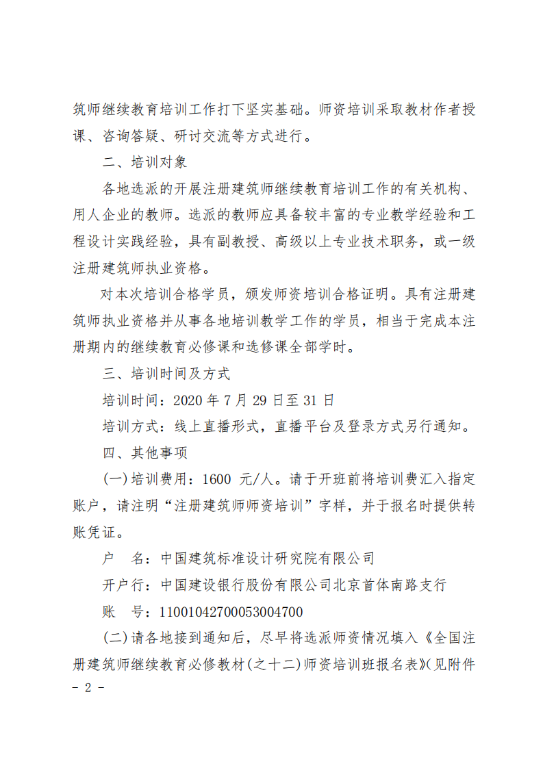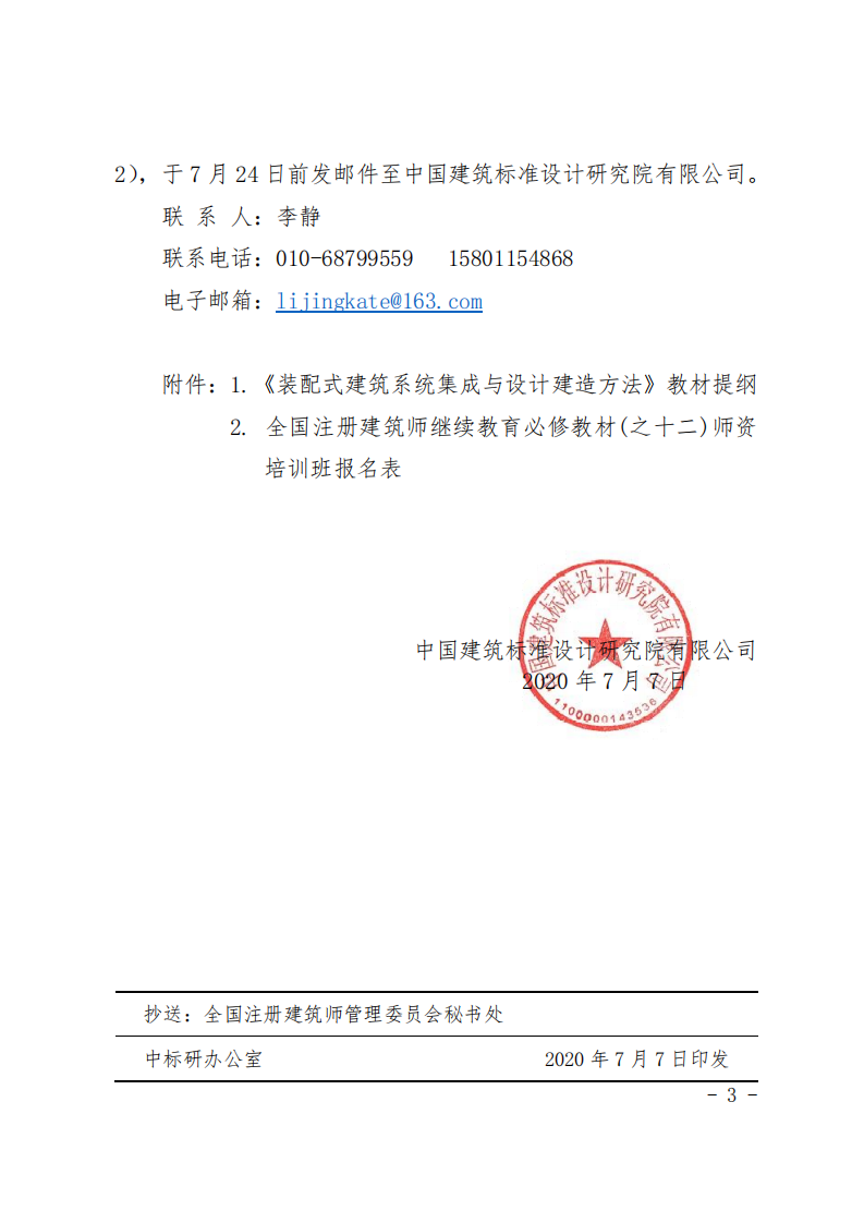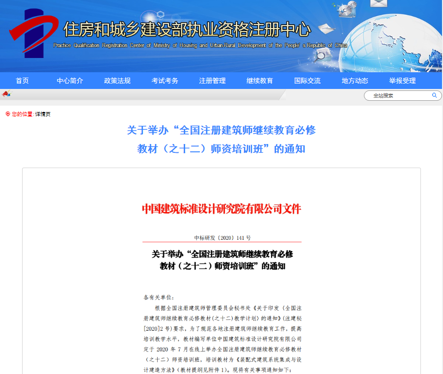 根據(jù)全國注冊建筑師管理委員會秘書處《關(guān)于印發(fā)〈全國注冊建筑師繼續(xù)教育必修教材(之十二)教學(xué)計劃〉的通知》(注建秘[2020]2號)要求,為了規(guī)范各地注冊建筑師繼續(xù)教育工作,提高培訓(xùn)教學(xué)水平,教材編寫單位中國建筑標(biāo)準(zhǔn)設(shè)計研究院有限公司定于2020年7月在線上舉辦全國注冊建筑師繼續(xù)教育必修教材(之十二)師資培訓(xùn)班(中標(biāo)研發(fā)[2020]141號),培訓(xùn)教材為《裝配式建筑系統(tǒng)集成與設(shè)計建造法》。師資培訓(xùn)采取教材作者授課、咨詢答疑、研討交流等方式進行。