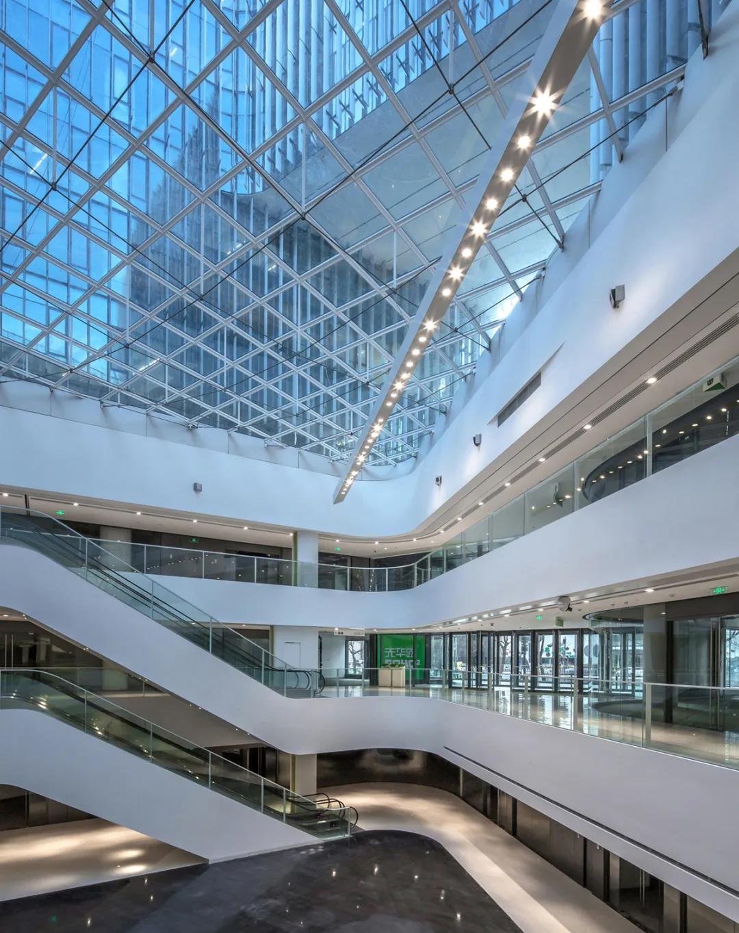 此外,建筑綜合體內(nèi)部的道路系統(tǒng)多為曲線。建筑底部三層空間圍繞兩座巨大的日光中庭布局,中庭可為來訪者提供明確的空間定位。
