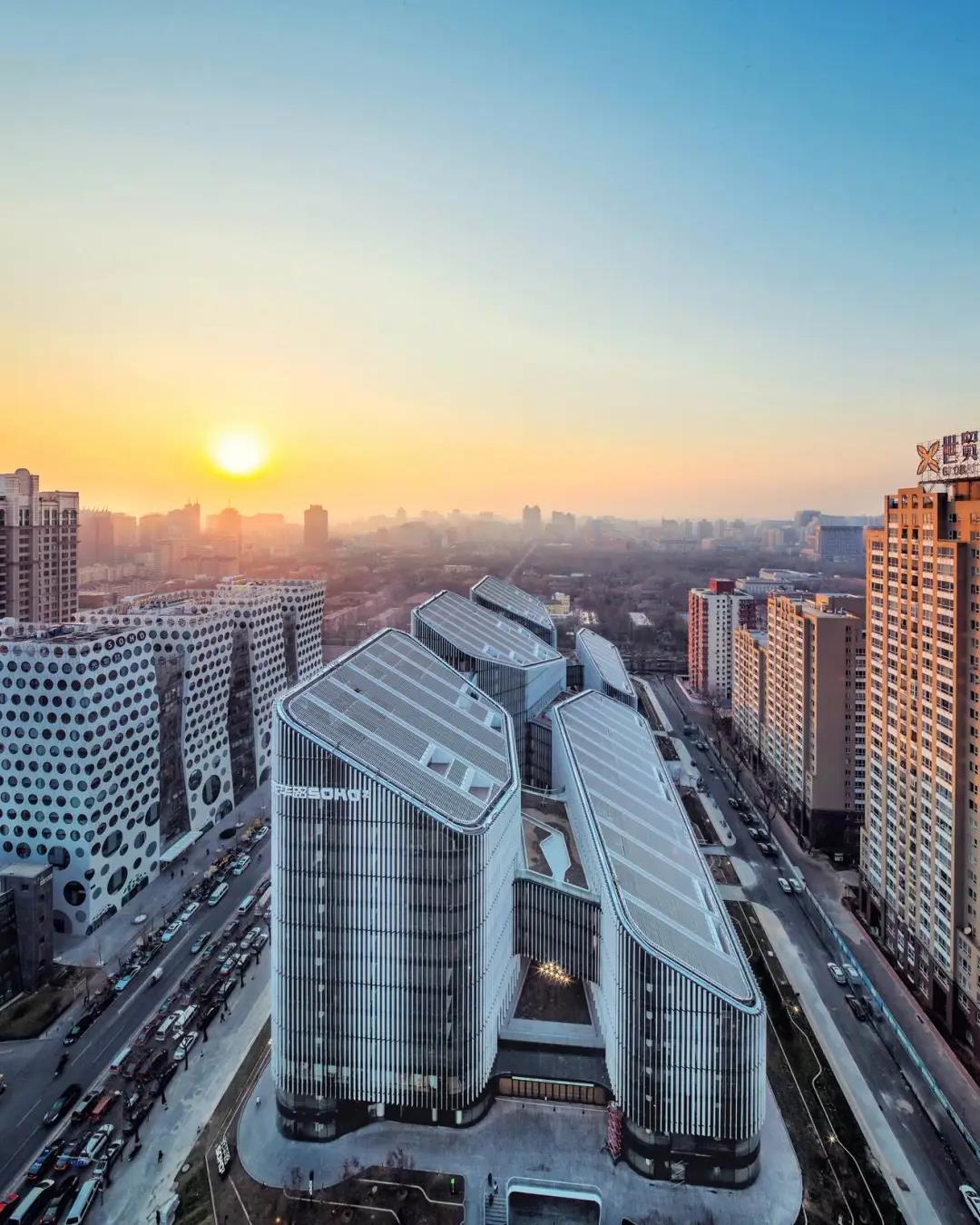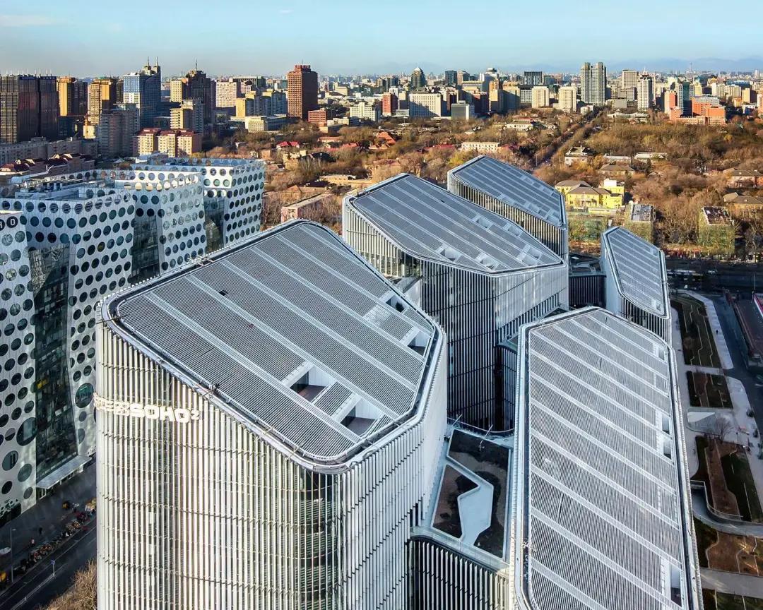 SOHO五棟建筑幕墻轉(zhuǎn)角流線一直延續(xù)到傾斜的屋面處,傾斜屋面的設(shè)計(jì)旨在避免遮擋北面住宅區(qū),在遵守當(dāng)?shù)厝照諛?biāo)準(zhǔn)的同時(shí)也成就了獨(dú)特的造型語言。屋面形成建筑“第五立面”,凹進(jìn)的平臺和日光中庭點(diǎn)綴其間。