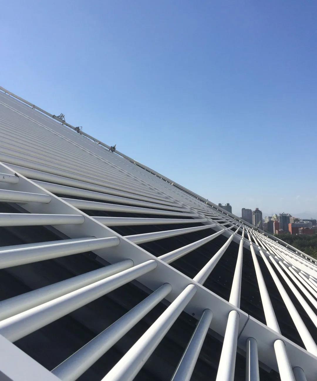 屋面體系為直立鎖邊+金屬鋼管組成的幕墻體系,利用周全排水溝及層層退臺的單獨(dú)排水有效的解決了排水及防雪墜落等問題。