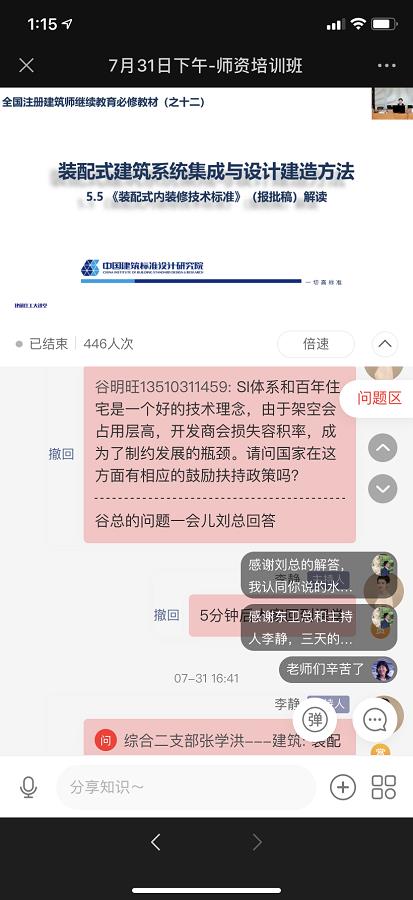 7月31日,結課之前的主編答疑環(huán)節(jié),各地學員對裝配式建筑的討論達到了高潮,比預計結課時間延后1小時結束。劉東衛(wèi)總建筑師解答完學員有關“智慧建造與城市未來發(fā)展”的最后一個問題,為2020年的全國注冊建筑師繼續(xù)教育師資培訓畫上圓滿的句號,為我國裝配式建筑領域發(fā)展創(chuàng)立新的標志!