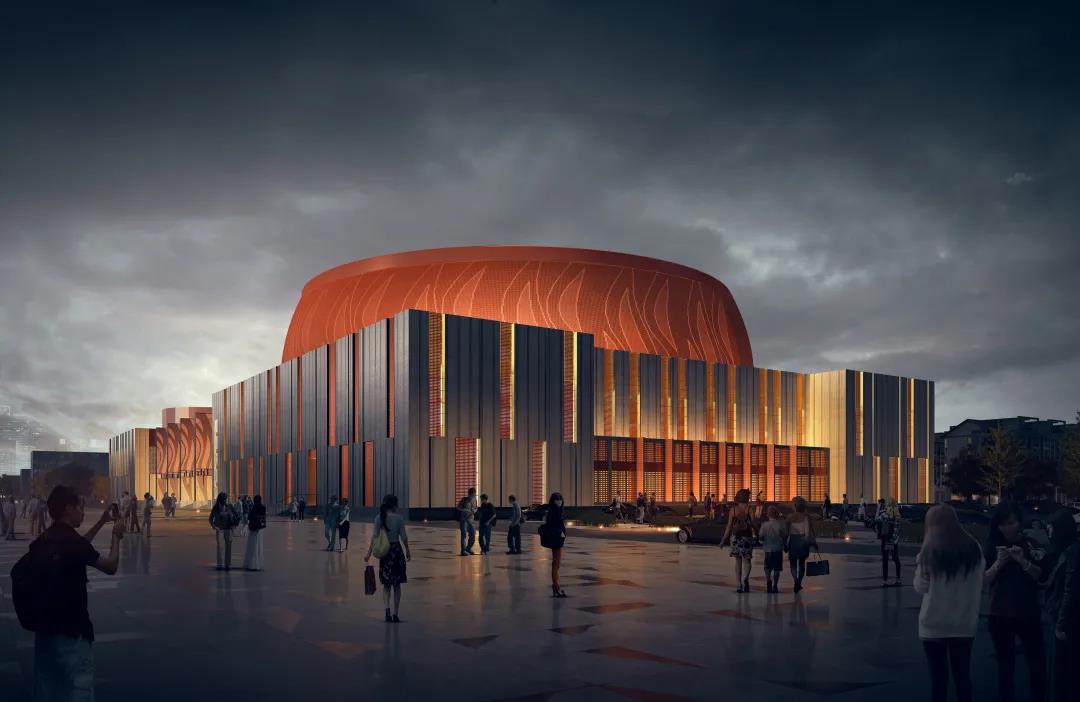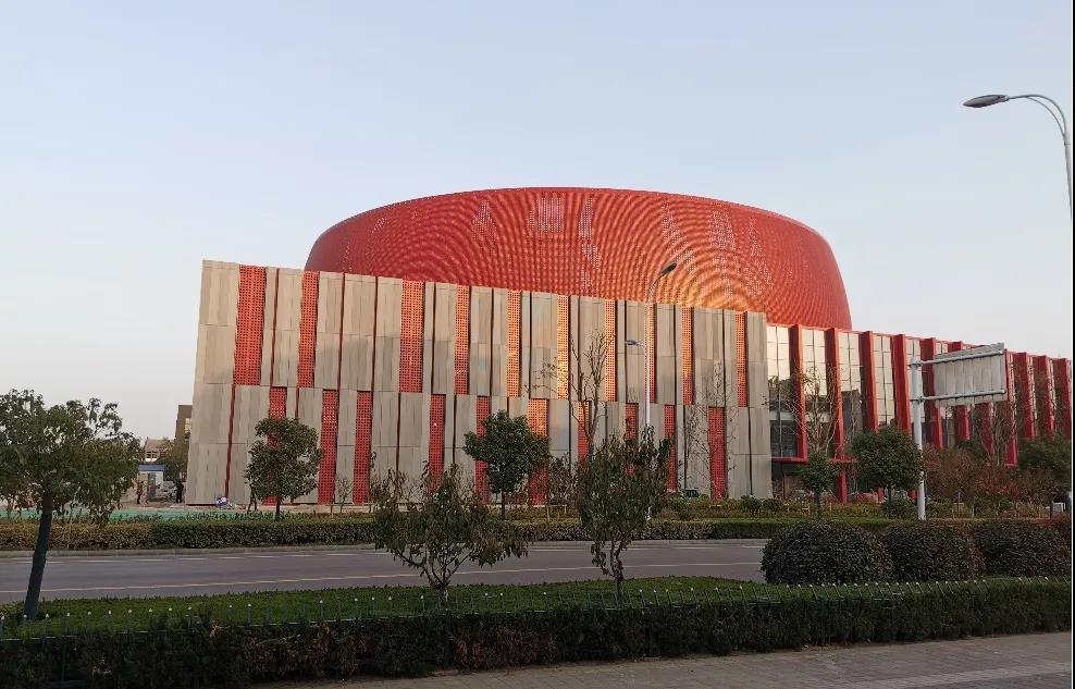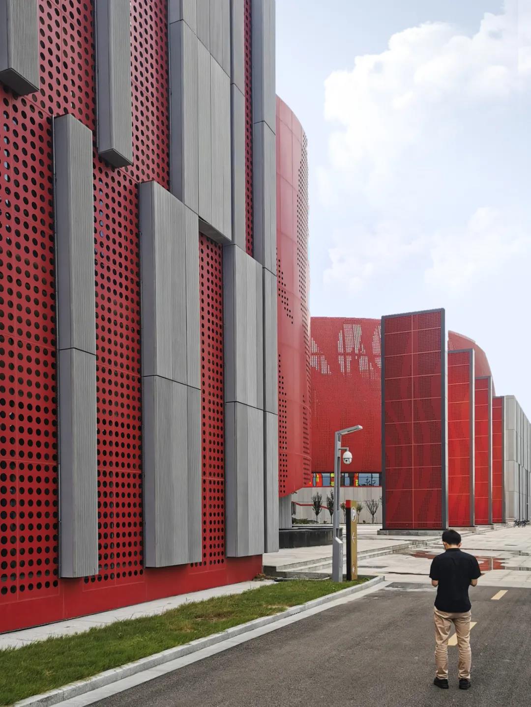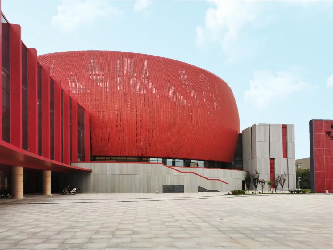 大劇院的用地南北長東西窄,建筑因循基地形狀呈南北方向布局,建筑由三個主要功能區(qū)組成,其中包括:北部為舞臺和1000座觀眾廳,中部西側為大門廳,中部東側為朝向新城中軸線的花鼓廣場,大劇院南部西側為影院,南部東側為文化館。我們將建筑北側劇場和舞臺塔用紅色穿孔鋁板將其包裹成為一個巨大的“鼓”,鼓面上大小孔洞通過組合形成連續(xù)的鳳凰擺尾的圖案。