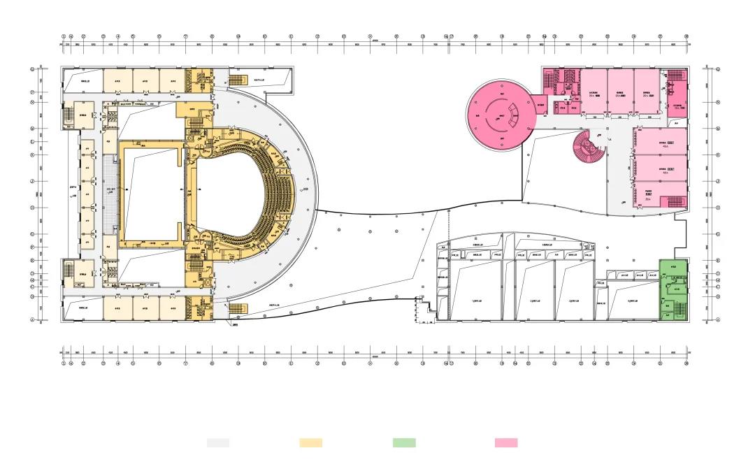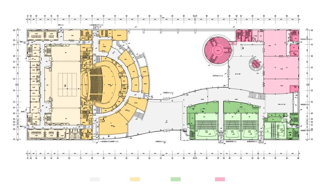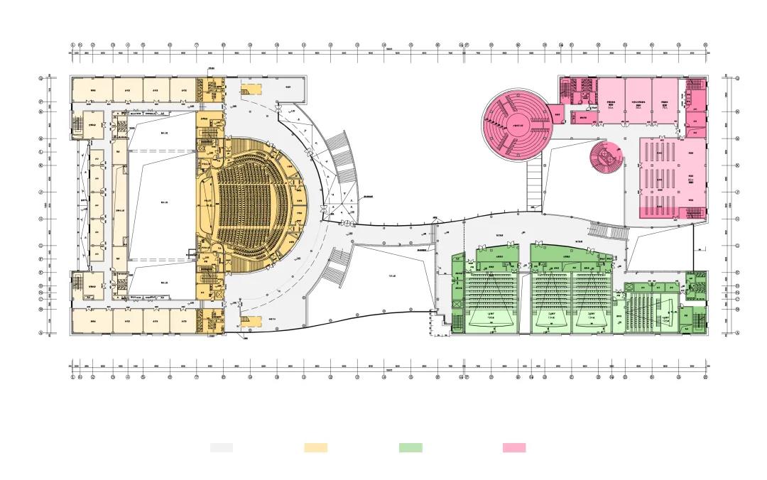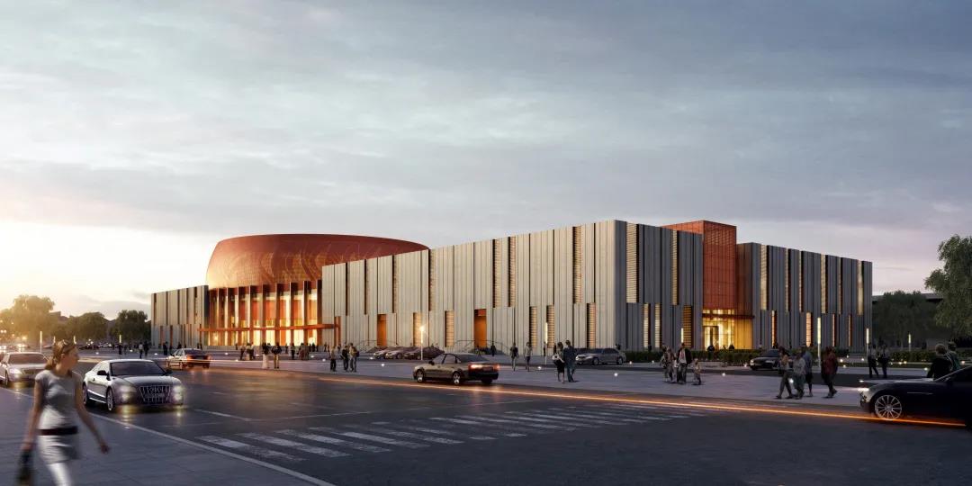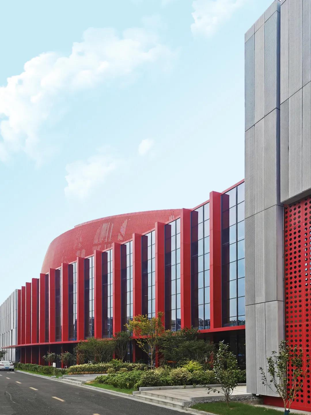 大劇院的用地南北長東西窄,建筑因循基地形狀呈南北方向布局,建筑由三個主要功能區(qū)組成,其中包括:北部為舞臺和1000座觀眾廳,中部西側為大門廳,中部東側為朝向新城中軸線的花鼓廣場,大劇院南部西側為影院,南部東側為文化館。我們將建筑北側劇場和舞臺塔用紅色穿孔鋁板將其包裹成為一個巨大的“鼓”,鼓面上大小孔洞通過組合形成連續(xù)的鳳凰擺尾的圖案。
