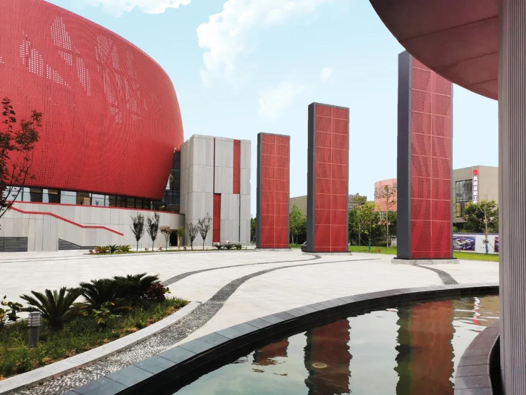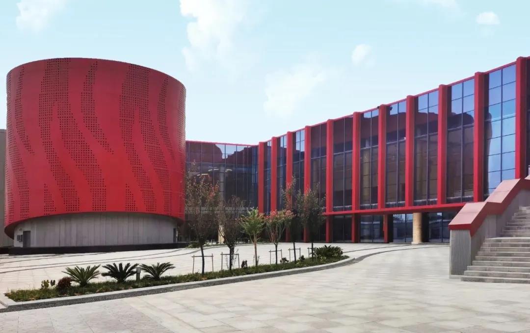 花鼓廣場邊的斜切的圓柱體以及影院入口上傾斜的立方體,表達了對歷史上中都城朱漆殿柱和紅色墻磚的追憶。花鼓廣場東側,沿南北方向分列四品鋼制屏風,其上用紅色鋁板合金穿孔板繪制出丹鳳朝陽的圖畫,與劇場的“紅色花鼓”上的鳳尾圖案相互呼應,四扇屏風界定了廣場的邊界,同時又如四扇打開的門,將城市軸線上的游客引入廣場空間,感受“天天花鼓節(jié)”的熱鬧。