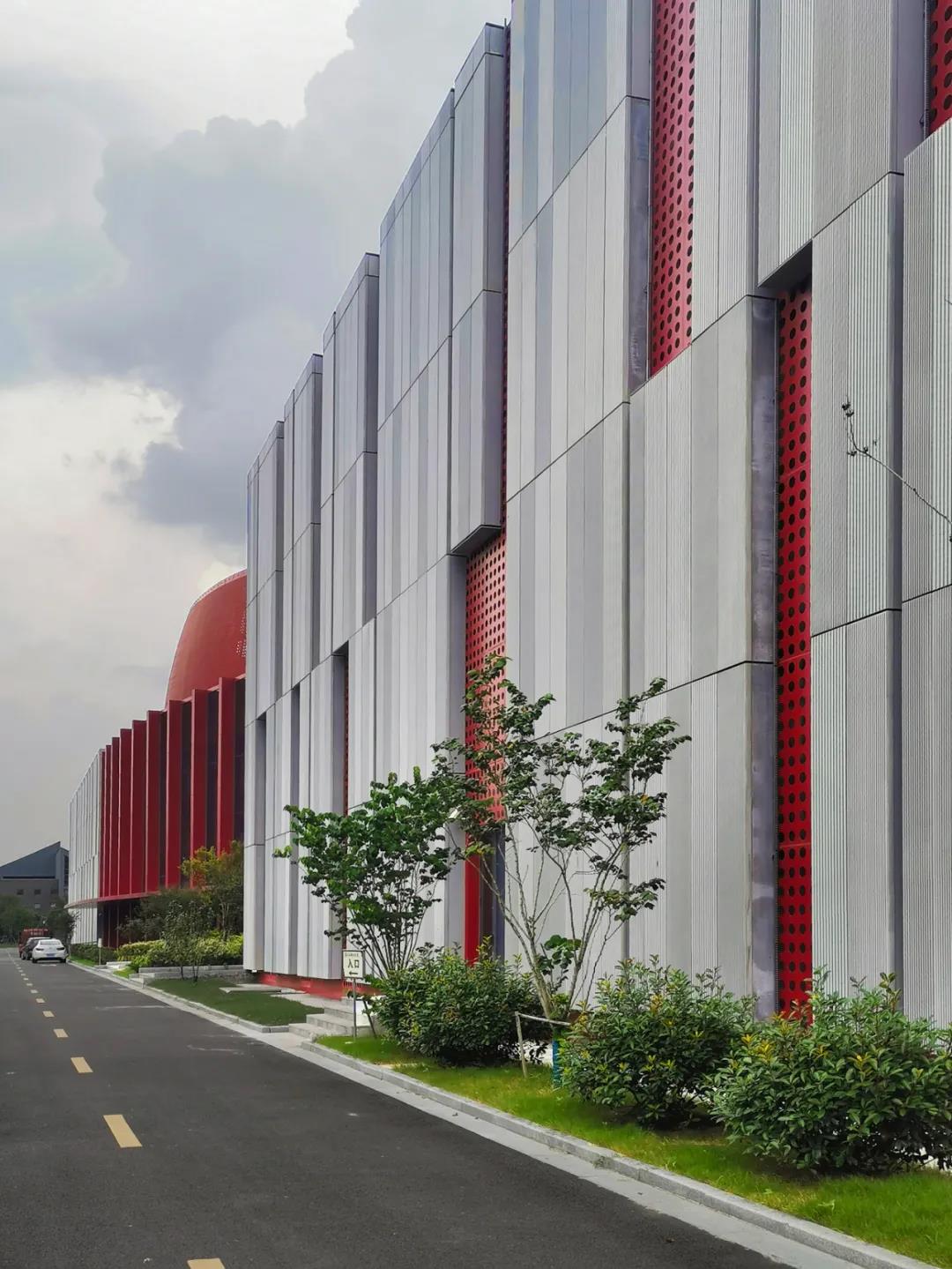 ALC板,寬度600毫米,紅色“音符”,寬度1200毫米和1800毫米。這兩個看似毫不相關的東西,通過建筑師的想象,通過模數(shù)的控制,完美的結合在一起,使得僵硬冰冷的材料有了有了生命,有了活力,成為了音樂的一部分。