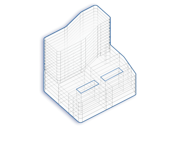 裙房中部設(shè)置醫(yī)療主街,東西布置模塊化醫(yī)療單元,單元之間嵌入庭院;東南角布置急診模塊;北側(cè)布置醫(yī)技模塊;南側(cè)布置門診模塊;上部布置護理單元模塊;護理單元模塊與醫(yī)技模塊間布置設(shè)備層。