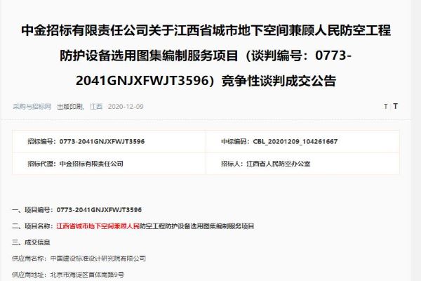 近日,中國建筑標(biāo)準(zhǔn)設(shè)計研究院(以下簡稱“標(biāo)準(zhǔn)院”)成功中標(biāo)《江西省城市地下空間兼顧人民防空工程防護(hù)設(shè)備選用圖集》編制服務(wù)項目,該圖集項目為江西省人防行政主管部門重點(diǎn)推進(jìn)工作之一。