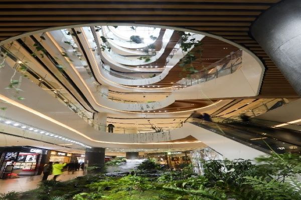本項目最初于2011年開始設(shè)計,2016年底全面竣工。原項目設(shè)計定位為“百貨類”商場,2019年由于運營主體變更,轉(zhuǎn)型為商業(yè)綜合體。改造設(shè)計的靈感來源于古巴比倫的空中花園,設(shè)計團隊通過業(yè)態(tài)的合理分布、空間的靈動融合、氣氛的營造烘托,致力于在風(fēng)沙較大的內(nèi)蒙古打造首家綠色有氧購物花園。在室內(nèi)空間通過綠植覆蓋、水系循環(huán)、原木造景等方式,結(jié)合流暢弧形的動線,呈現(xiàn)出自然原生態(tài)的購物感官,形成城市中的優(yōu)雅森林、大自然中的購物中心。