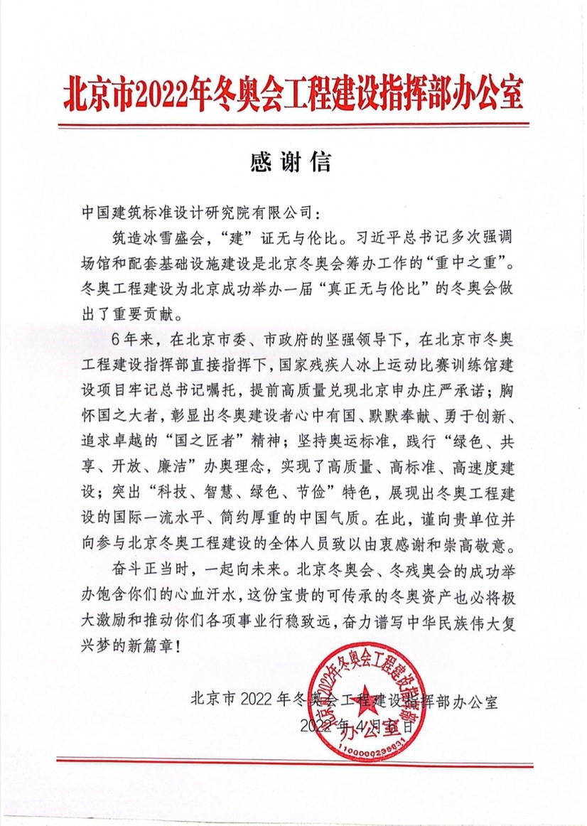 近日,北京市2022年冬奧會工程建設(shè)指揮部辦公室向中國建筑標準設(shè)計有限公司(以下簡稱“標準院”或“公司”)致以感謝,肯定了標準院在國家殘疾人冰上運動比賽訓(xùn)練館建設(shè)項目中做出的突出貢獻。設(shè)計中,我們貫徹以人民為中心的發(fā)展理念、堅持世界眼光、國際標準、高點定位、中國特色的要求和貫徹開放共享理念,做到殘健融合、冬夏轉(zhuǎn)換。同時充分考慮了殘疾人運動員需求特點,推陳出新,為建造具有無障礙示范引領(lǐng)作用的專業(yè)化冰上比賽訓(xùn)練館做出了表率,并成為國內(nèi)高標準無障礙環(huán)境建設(shè)的示范項目。冬奧會及冬殘奧會舉行的賽前和賽中,標準院成立涉奧服務(wù)保障工作領(lǐng)導(dǎo)小組和工作小組,開展一些列的冬奧保障工作。我們欣喜的看到長期在冰上館備戰(zhàn)的兩支冰上項目球隊在本屆冬殘奧會上均取得了優(yōu)異的成績,中國殘奧冰球隊勇奪銅牌,中國輪椅冰壺隊奪金成功衛(wèi)冕。